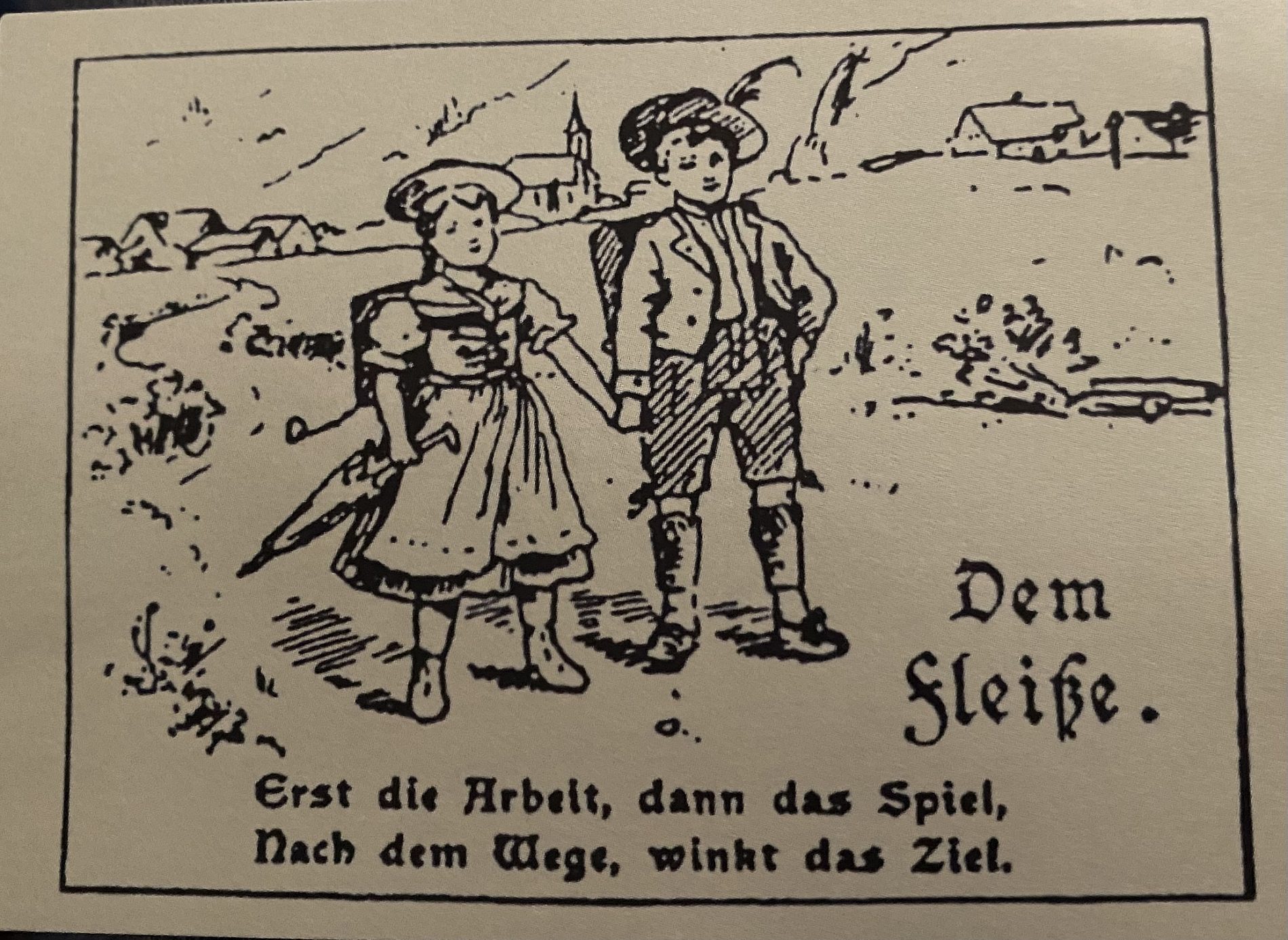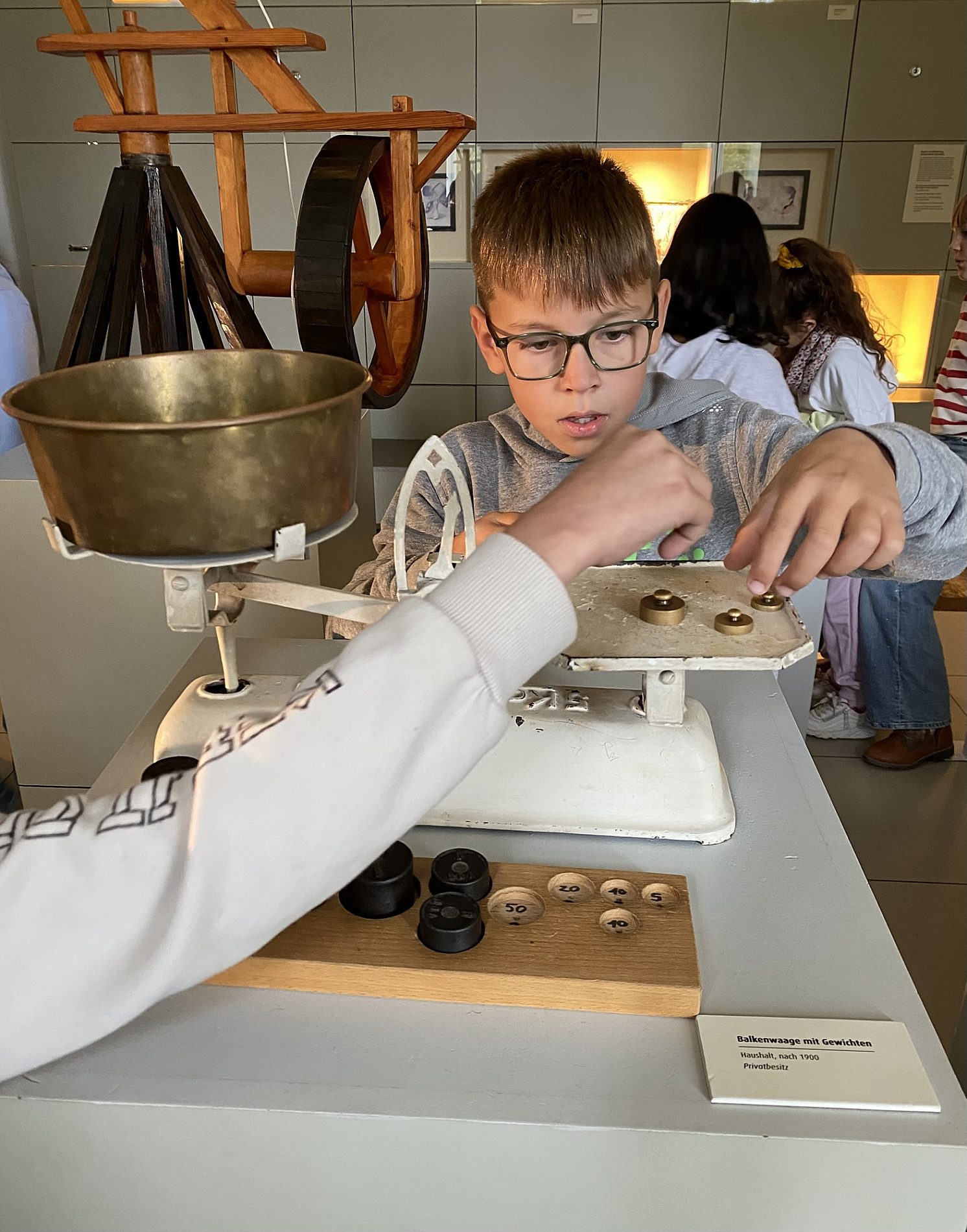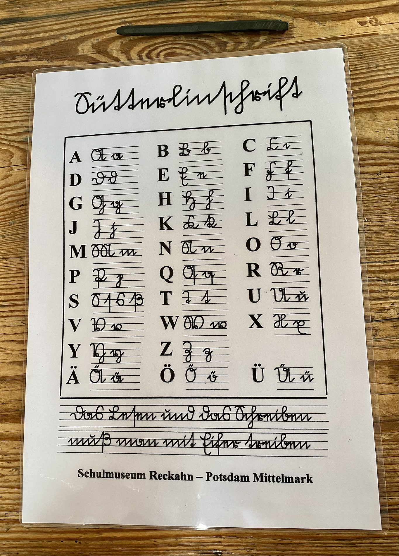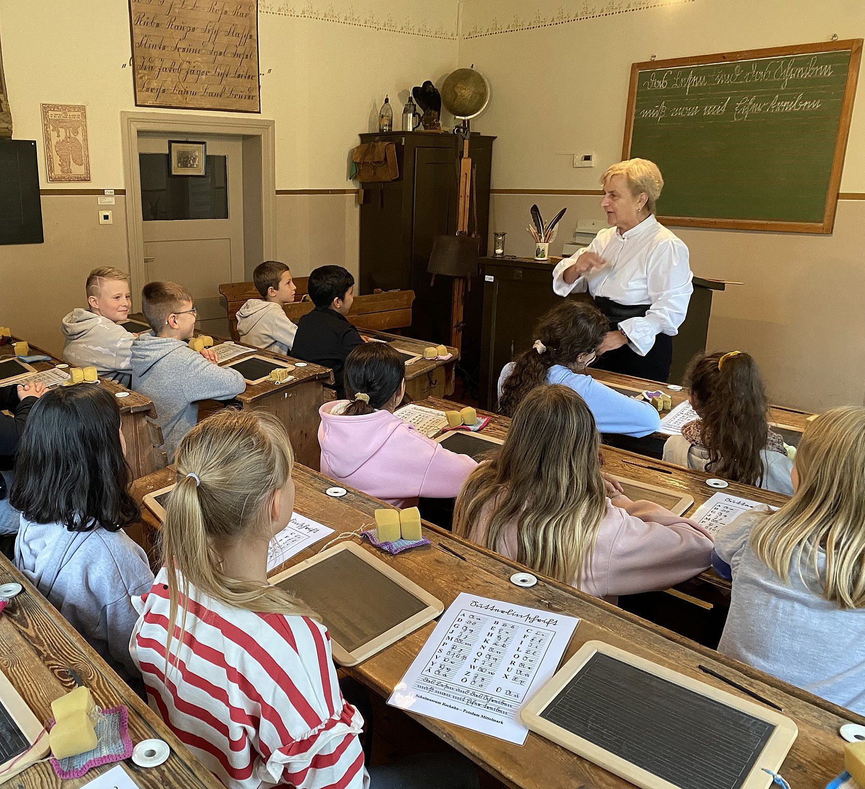 Wie man in dieser Schule gelernt hat, konnten wir danach gleich selbst testen. Im historischen Schulhaus von 1773 haben wir auf alten, engen Holzbänken gesessen und der strengen Lehrerin „Fräulein Koch“ zugehört. Wir mussten stillsitzen und durften nicht reden, bis wir gefragt wurden. Dabei waren Antworten in ganzen Sätzen wichtig, wenn man gelobt werden wollte. Doch zuerst hat „Fräulein Koch“ alle Hände und bei den Jungen auch die Ohren auf Sauberkeit untersucht. Dann hat sie mit uns eine Geschichte aus einem alten Lesebuch gelesen und wir haben einige Buchstaben in der alten Sütterlinschrift mit dem Griffel auf eine Schiefertafel geschrieben. Es hat uns riesigen Spaß gemacht und zum Schluss bekamen alle ein Fleißkärtchen.