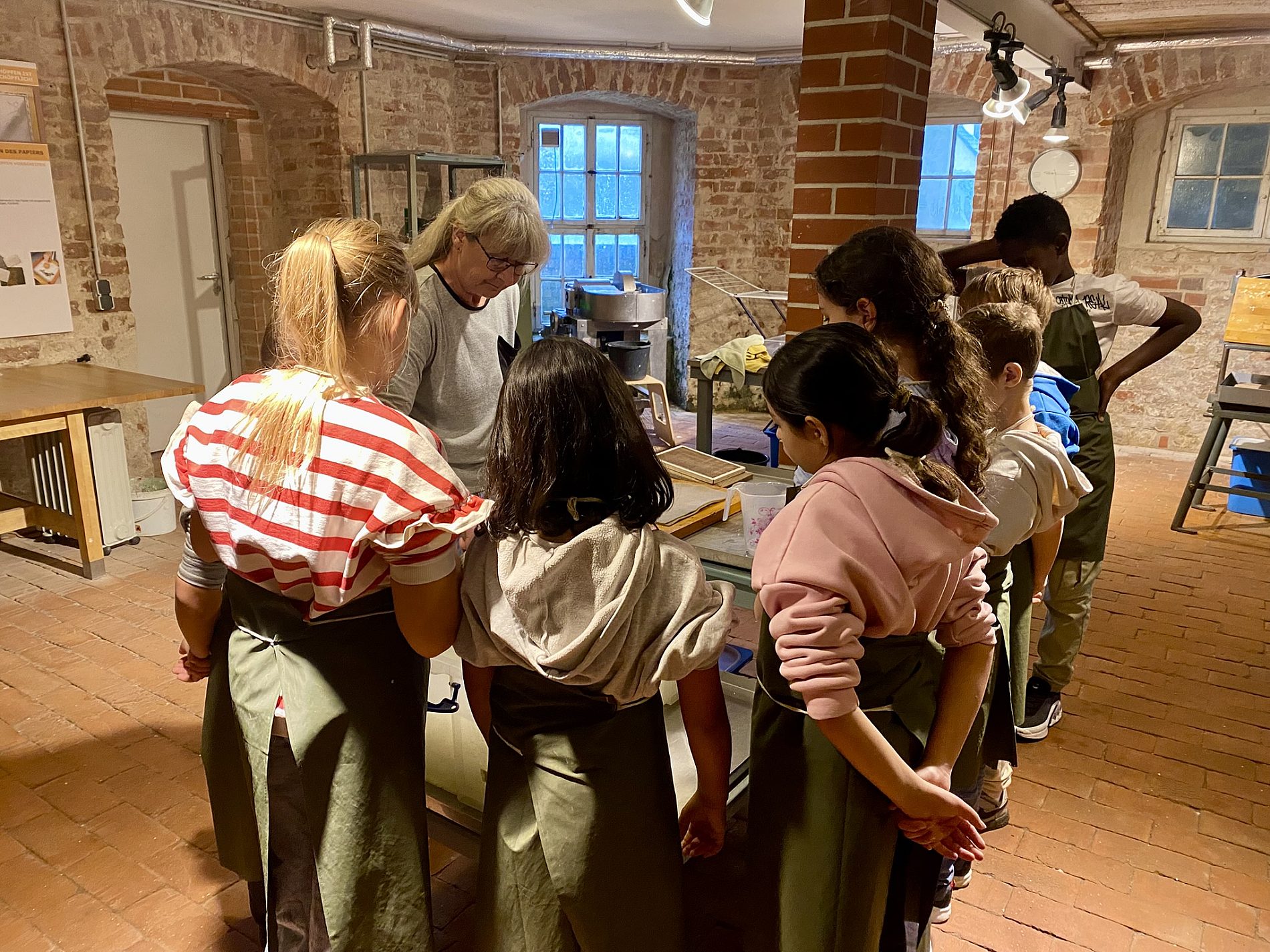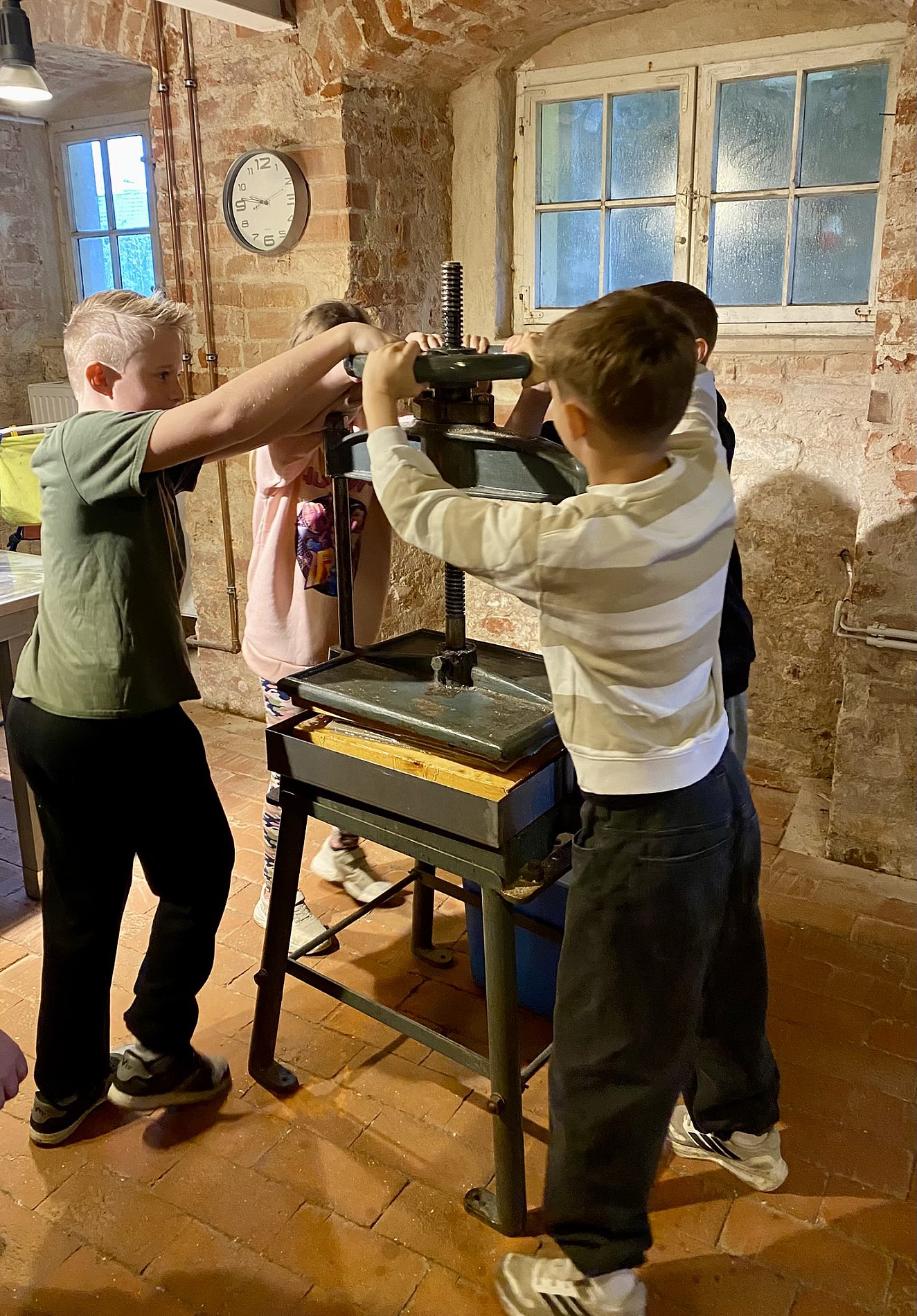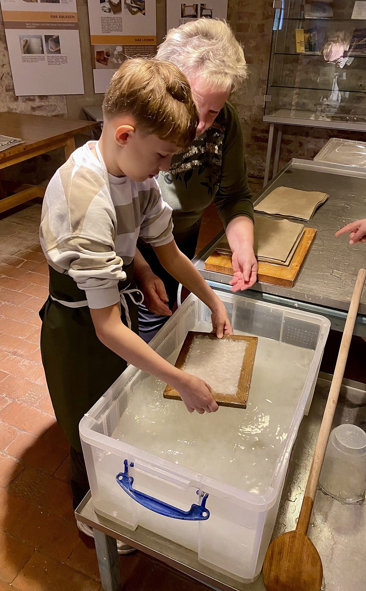 Aber noch war unsere Entdeckungsreise nicht zu Ende. Es ging noch einmal zurück, in den Keller des Schlosses. Dort haben wir gelernt, wie man früher Papier geschöpft, also hergestellt hat. Das war eigentlich nicht schwierig, aber eine ziemlich nasse Angelegenheit und für das Bedienen der Papierpresse brauchten wir viel Kraft. Am Ende durfte jeder zwei handgeschöpfte Blätter mit nach Hause nehmen und kann jetzt daraus tolle Sachen, zum Beispiel Weihnachtskarten oder Einladungen, basteln.