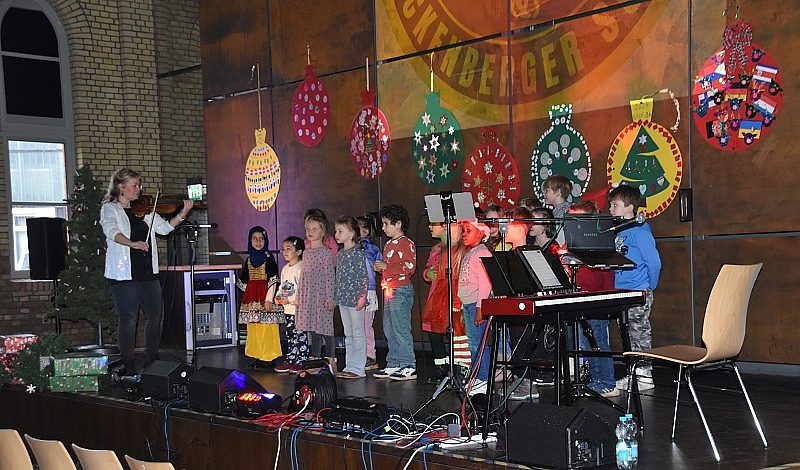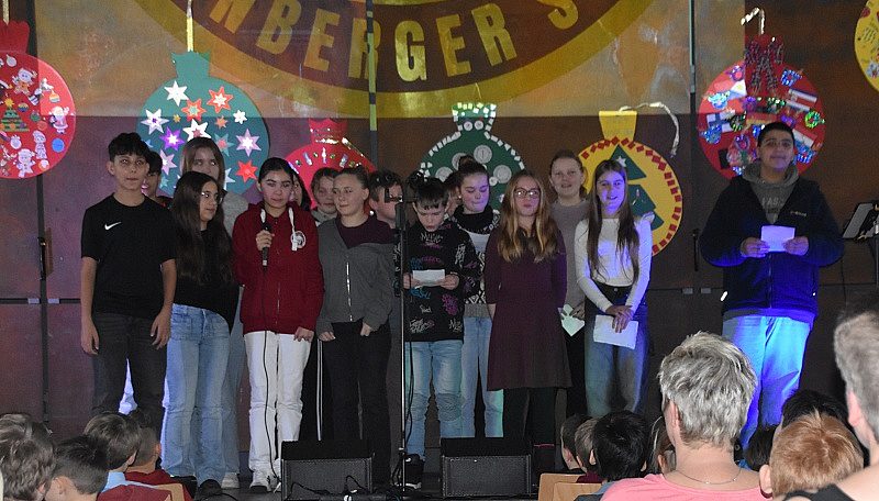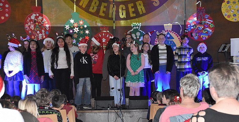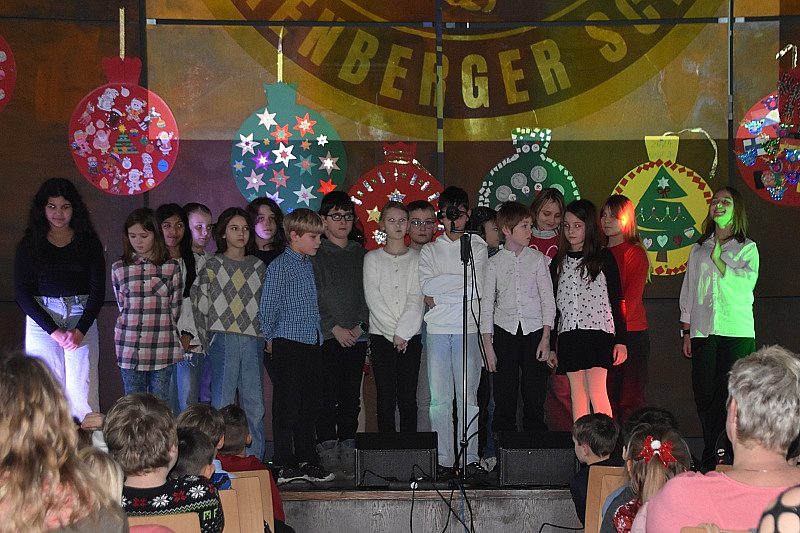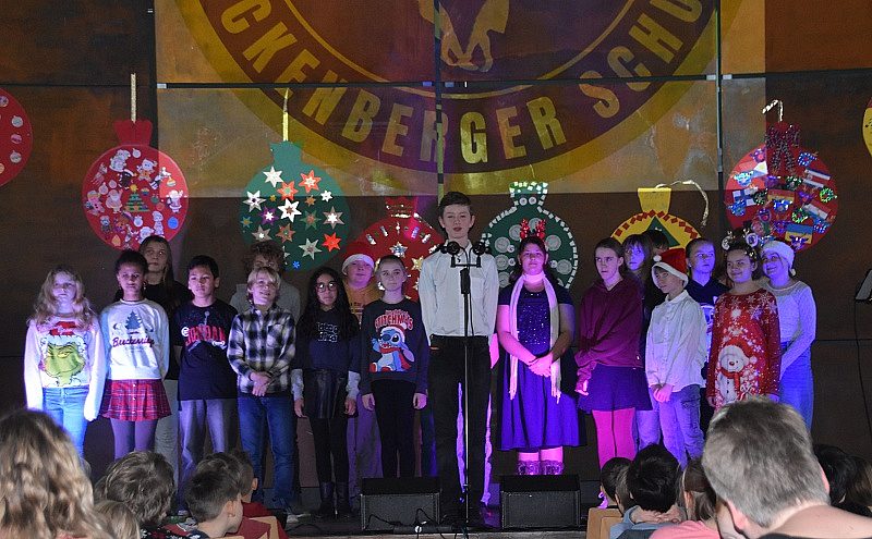 “Jauchzet, frohlocket” - mit den Klängen aus dem Weihnachtsoratorium von J.S. Bach wurde es sofort still im Saal. Gekonnt führten Mavie und Jannik aus der Klasse 6a durch das Programm, vielen Dank euch beiden für die sehr netten Worte. Nacheinander führten alle Klassen Gedichte und Lieder auf - manche neue Lieder, aber auch viele bekannte, bei denen mitgesungen und mitgeklatscht wurde. Auch die AllStars sangen 2 Lieder aus ihrem Programm. Alle Klassen erhielten, natürlich vom Weihnachtsmann, ein großes Überraschungspaket - geöffnet wurde es wohl erst in der Schule.